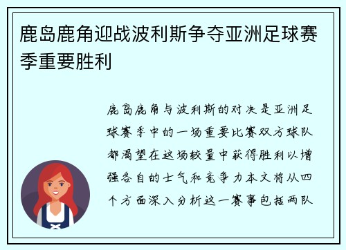在意甲联赛的激烈竞争中,萨索罗主场迎战都灵的比赛成为了众多球迷关注的焦点。这场比赛不仅关系到双方在积分榜上的位置,更是对球队士气和战斗力的一次重要检验。萨索罗自本赛季以来表现起伏不定,而都灵则希望能够借此机会争取更多的积分,提升排名。两队都有着各自的目标与愿望,在即将到来的较量中,双方势必会全力以赴,为了宝贵的三分展开激烈拼搏。本文将从球队状态、历史交锋、战术布置及球迷氛围四个方面详细解析这场关键...